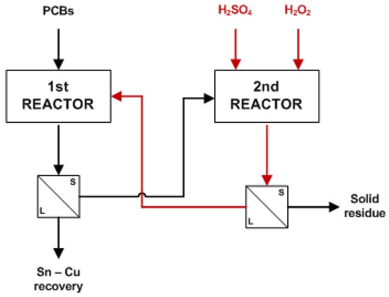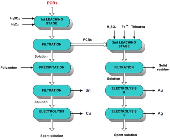 Figure 1. This process is characterized by a two-stage leaching section: in the first stage, base metals such as copper (Cu) and tin (Sn) are extracted, whereas precious metals, i.e., gold (Au) and silver (Ag), are brought into solution in the second stage. This selective leaching is very helpful in separating metals already in the leaching section: this allows the efficient recovery of all of them in terms of total mass and grade. After the first leaching stage, the PCBs’ solid undergoes a 24% weight reduction.