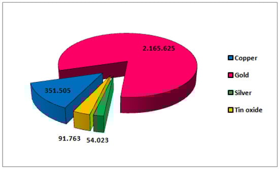 The recovery of Au and Ag by the electrodeposition is in the 85–95% range, and the energetic consumption is 4.1–4.4 kWh/kg per process. Unfortunately, the current efficiency is rather low, i.e., 15% for gold and 12% for silver. These efficiencies can certainly be improved with a higher concentration of the precious metals, which could be achieved by a countercurrent thiourea leaching stage or by processing PCBs with greater precious metal content.