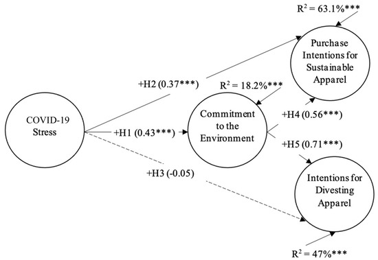 For example, anxiety due to the perceived threat to climate change and poor environmental health led to adaptive behaviors such as climate activism to reduce the carbon footprint [23,54]. The fear of COVID-19 was found to be positively correlated with low-carbon footprint behaviors [29,30,31]. Integrating this literature with the cognitive dissonance theory [45] and compensatory consumer behavior model [41], we suggest that this COVID-19-stress will motivate millennials to protect the environment in the hope of improving environmental health and becoming more immune to the health risks associated with the pandemic. Soga et al. [55] suggested that COVID-19 has altered human–nature interactions in significant ways which can have a long-term effect on human behavior to protect the environment. Based on the cognitive dissonance theory [45] and compensatory consumer behavior model [41], we suggest that having higher COVID-19-stress will increase commitment to the environment, increasing the assurance that improved environmental health will help in ending the pandemic and making humans more immune to combat the disease. Based on this discussion, we propose the following hypothesis.