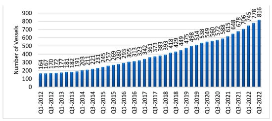 According to Clarkson Research [], the number of LNG-powered vessels has been steadily increasing since 2012 (Figure 2). As a result, the number of LNG-capable vessels increased to 816 in the third quarter of 2022.