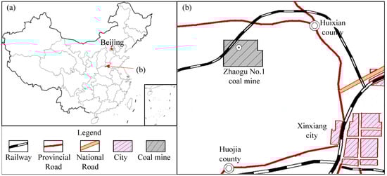 (a) The location of Zhaogu No. 1 coal mine of Henan Province, China; (b) enlarged drawing of the location of Zhaogu No. 1 coal mine.