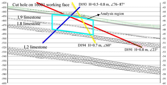 Figure 2 shows the profile map along the ventilation roadway of the 16001 working face. The green line represents the mining area of coal seams. There are three floor aquifers of the 16001 working face, namely L9, L8 and L2. The L9 aquifer is a water-free limestone layer at a distance of 16.4~20.5 m from the floor of the coal seam, and the average thickness is 2 m. The L8 limestone aquifer is the direct water source, with an average thickness of 8.0 m, a distance of 26.0~8.0 m from the floor of the coal seam, and a water pressure of 5.0~5.3 MPa. The water inrush coefficient is greater than 0.1, and there is a risk of water inrush. The average thickness of the L2 limestone is 16.1 m, the upper distance from the coal floor is 88.3~98.8 m, and the water pressure is 6.1~6.7 MPa. The water inrush coefficient is less than 0.1.