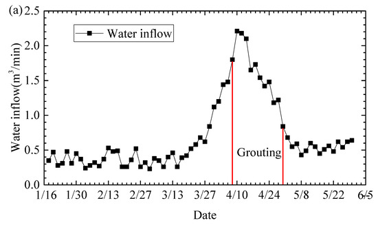 3.2. Monitoring Results of Water Inflow and Microseismic Events