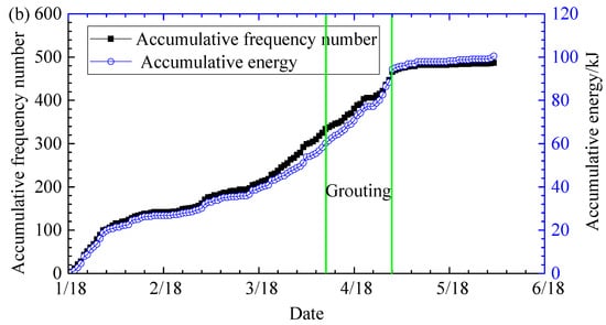 The water inflow of the 16001 working face led by fault activation and the accumulative frequency number and energy of microseismic events in the “analysis region” that changed with the date can be seen in Figure 4. According to the observation record of the water inflow on the working face (see Figure 4a), the water inflow increased sharply after 27 March. It was found that there was obvious water gushing in the bracket area on the upper part of the working face. In order to prevent the fault from continuing to activate and form a strong water channel, which could cause water inrush on the working face, grouting reinforcement was carried out on the floor from 8 April to 30 April, which can be seen in Figure 4.