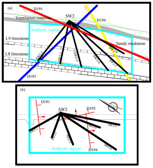 From Table 4 and Figure 5a, one can observe that the SW2-1~5 drilling hole’s final location was L8 limestone. The final location of the drilling hole of SW2-6′s was sandy mudstone. According to Figure 5, the location of the fault activation was covered by grouting. The grouting was conducted using 42.5 ordinary silicate cement: the water–cement ratio was 1:0.3~1:1, the grouting pressure was 8 MPa and the grouting period was from 8 April to 30 April. It can be seen from Figure 4a that the water inflow of the working face firstly increased and then decreased rapidly during grouting, indicating that grouting played a significant role in sealing the water channel. It can be seen from Figure 4b that the accumulated frequency number and accumulated energy increment of microseismic events in the “analysis region” had been significantly reduced after grouting, indicating that the strength of the rock mass in the “analysis region” had been increased after grouting, and it was difficult to be destroyed under the influence of mining, resulting in the decrease of the microseismic index.