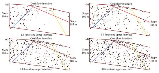According to the disclosure and exploration results, the influence areas of faults D191, D193 and D194 on the water-barrier layer of the floor are divided, which are the “analysis region” with a cyan block box in Figure 2 and Figure 3. Since the beginning of the operation of the microseismic system on 18 January, there have been events located in the “analysis region”. Until the advance of the working face by 255 m on 31 May, there were no more microseismic events located in the “analysis area”. The distribution evolution process of microseismic events in the “analysis region” during this period are shown in Figure 6.