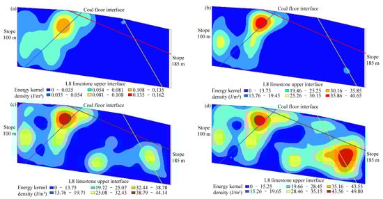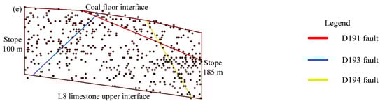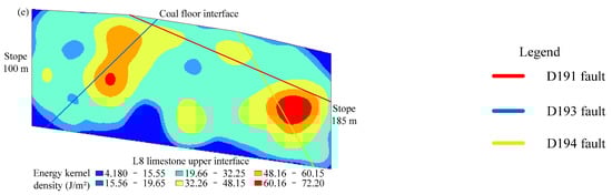 (3) Sign stage of fault activation: Until 4 April, the working face was about 10 m from the left boundary of the “analysis region”. It can be seen from Figure 6c that the accumulation of microseismic events near faults D191 and D194 had further increased. Figure 7c illustrates that, in addition to the two regions with large energy kernel density values in the previous stage, there were two additional regions. One was located near the L8 limestone interface in the middle of the “analysis region”, and the other was near the intersection of fault D191 and fault D194, with an energy kernel density of 20~30 J/m2. The reason was that the rock mass at the fault junction was of low strength, and the tectonic stress and advanced concentrated stress interacted and superimposed each other, resulting in rock mass fracture and microseismic event accumulation. For the “analysis region”, this period could be referred to as the sign stage of fault activation. Therefore, grouting (see Figure 5) was adopted to reinforce and improve the damaged rock mass.