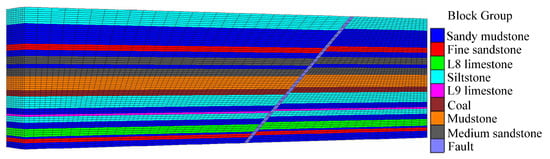 FLAC3D 3.0, a numerical simulation software, was used to simulate the floor failure law of confined water mining with the fault working face, and to study and analyze the evolution law of the plastic failure zone and stress field during mining. The simulation model was set up based on the geological conditions of the 16001 working face in Zhaogu No. 1 coal mine. The length, width and height of the numerical simulation model were 500, 50 and 140 m, respectively. The model included an 80 m roof and a 50 m floor of seam numbers two and one, and a 6 m coal seam thickness. In the model, the buried depth of coal seam was 540 m, and a stress boundary of 11.5 MPa was applied on the upper part of the model to simulate the dead weight of the overlying strata. A stress boundary of 5 MPa was applied to the interface of the L8 limestone to replace the confined water pressure. The horizontal displacement was constrained by the left and right boundaries, and the vertical displacement was constrained by the bottom boundary. The fault cut through the entire model and the fault inclination angle was simulated to be 45°. The drop and fault plane width were 1.0 and 2 m, respectively. The cutting hole of the working face was located in the upper wall of the fault, 160 m away from the fault surface, and the advancing direction was from the upper wall to the footwall. The physical and mechanical parameters of each rock strata (obtained from field sampling and laboratory tests) are shown in Table 5, and the constructed numerical model is shown in Figure 8.