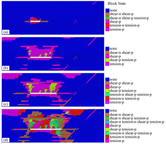 Figure 9 shows the distribution of the plastic failure region of the surrounding rock under different excavation steps. As can be seen from Figure 9a, in the process of a 40 m advance from the cutting hole of the working face, the plastic failure area of the surrounding rock was mainly distributed around the working face, and the maximum plastic failure depth of the floor was about 6 m. Because the working face was far away from the fault, the surrounding rocks in the area near the fault did not incur a plastic failure, which suggests that mining activities do not affect the floor containing the fault. Combined with the monitoring results of the microseismic monitoring system, it was concluded that this stage belonged to the “previous mining affects stage”.