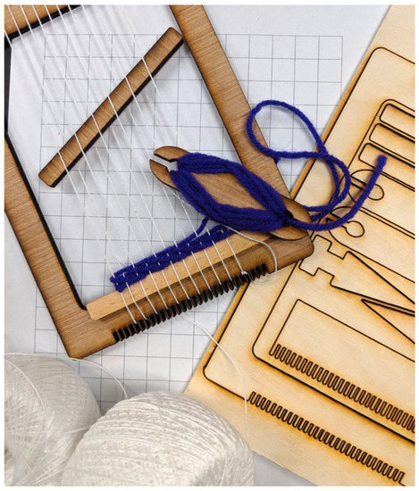 Frame loom, laser-cut loom parts, yarn, grid paper.