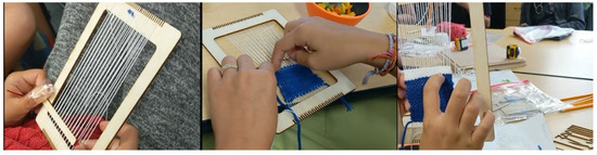 Later in the workshop, on Day 4, one of the ways tinkering manifested was through youth trying unexpected solutions, such as using pencils as needles and incorporating unintended occurrences into their designs. This view of tinkering is related to the way tinkering has been described as working with materials in ways that lead to new discoveries about phenomena [24,25]. Tinkering in this way also requires that multiple ways of thinking, doing, and solving problems are allowed and seen as valuable, which may not always be the case in typical math classrooms. Trying unexpected solutions allows youth to play with and push the boundaries of the materials and structures, as well as suggesting that the inherent math in weaving can be flexible. Five of the thirteen youth were seen doing this on Day 4.