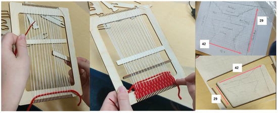 The current study focuses on different aspects—primarily action and process—of the same weaving workshop described in forthcoming work [41]. The workshop took place over six one-hour long sessions during the school day. Two participants were absent from school during one of the sessions; otherwise, the participants attended all six days and stayed for the full session. In these sessions, youth used frame looms that were laser-cut from an open-source pattern to create their woven artifacts and grid paper to plan their designs (see Figure 1 for an example image of the loom and grid paper).