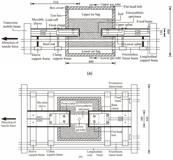 The dimensions of the test box were 400 mm × 400 mm × 400 mm (length × width × depth), containing the soil and providing an in-soil environment to the in-soil geosynthetics tests. Two separate pressurized air bags were used on the upper and lower parts of the test box to apply uniform confining stress to the upper and lower soil. The upper air bag was connected to a box cover. Air pressure was exerted by an air compressor in the laboratory. The air bags were anchored to the top of the test box using flat-head bolts. The air bag inflated by the upper and lower gas tubes could apply confining pressures as high as 200 kPa. The maximum pulling force of the test apparatus was 100 kN, moving at a displacement rate of 0.01–100 mm/min and with an elongation resolution of 0.001 mm. The upper or lower splint with interior groove of each loading clamp was manufactured from steel plates, bolted together by flat-head bolts rigidly gripping the geosynthetic specimen. A rigid movable sleeve with dimensions of 510 mm × 280 mm × 130 mm (indicating length × width × depth) was used to contain the clamp attached to the load cell. To make the sleeve move with the clamp simultaneously, the sleeve support frames maintaining a horizontal displacement were applied to support the sleeve.