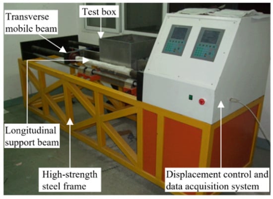 The sleeve, in most studies, was fixed on the front wall of the test box, so the effect of its weight was eliminated. The clamp moving through the sleeve had relative displacement with the existing apparatus [,,], which created interaction between the clamp and sleeve that caused inaccurate measurement of the tensile load of geosynthetics. The technical characteristics of the new in-soil tensile test apparatus in this study can be summarized as follows: compared to the previous test apparatus, the tensile load of the specimen was accurately measured by setting the sleeve outside the clamp and moving it simultaneously with the clamp. The new in-soil tensile test apparatus can simulate the real working state of geosynthetics and apply uniform confining stress to the upper and lower soil in the test box. The new apparatus can safely perform various tests, including the in-soil tensile test, the in-air tensile test, the pullout test, the unilateral tensile test and the bilateral tensile test.