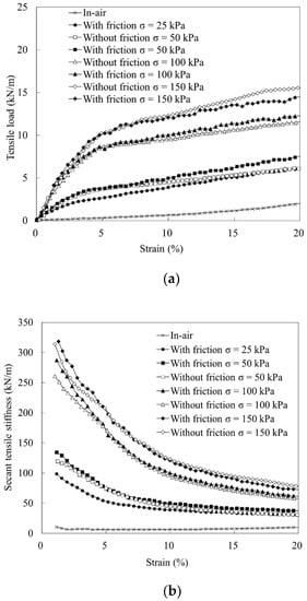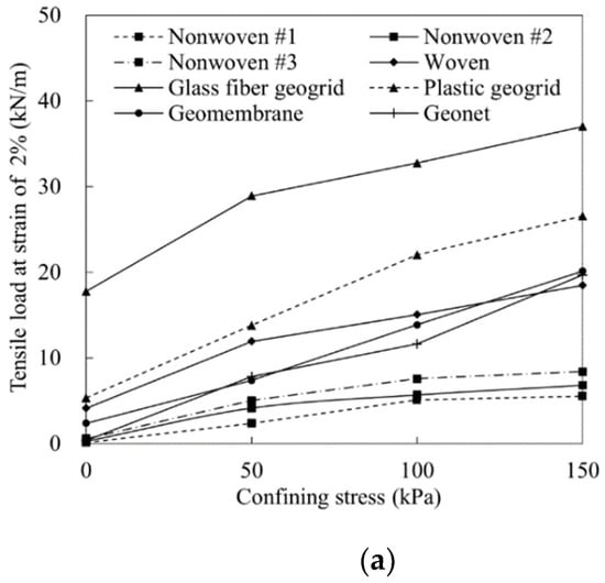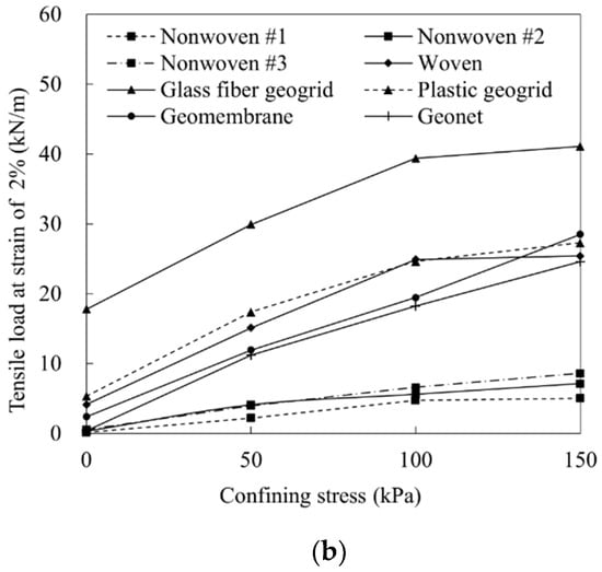 Figure 4 shows the tensile load of eight types of geosynthetics under different confining stresses at 2% strain. The tensile load at 2% strain was commonly used to study the properties of geosynthetics according to [,], showing that the tensile load with the friction of geosynthetics improved with the increase of the confining stress. For the glass fiber geogrid, the tensile load with friction was 17.77 kN/m in air, so the tensile load of 28.91 kN/m under the confining stress of 50 kPa was 62.69% higher than that in air. Under the confining stress of 100 kPa, the tensile load of 32.74 kN/m was 13.25% greater than that under the confining stress of 50 kPa. Figure 4b shows that the tensile load without friction from geosynthetics increased with the growth of the confining stress. Each geosynthetic had the greatest tensile load at the greatest confining stress of 150 kPa. Some researchers [,,] have observed similar results to the findings presented in this paper. Whether the tensile tests were conducted with or without friction, the tensile load for each type of geosynthetic had the smallest value under no confining stress (representing the in-air test) and had the greatest value under the confining stress of 150 kPa. However, the tensile loads for the tests with and without friction are similar, indicating that the friction had little influence on the tensile properties of the geosynthetics. For the in-soil tensile test with friction, a greater tensile load and secant tensile stiffness of geosynthetics were found compared to that in the in-air tensile test, which was mainly due to the confinement and the interaction of reinforcement–soil interface. The geosynthetics deformed and had displacement relative to the soil particles after the application of the tensile force, so the interface friction between reinforcement and soil increased the tensile properties of geosynthetics. For the geogrid-type geosynthetics (i.e., glass fiber geogrid, plastic geogrid and geonet) under confinement, the passive resistance existed between geosynthetics and soil except for the friction, which restricted the ability of the geogrid for displacement that would improve its tensile load. Additionally, the confinement restricted the movement and necking of geosynthetics in soil and made soil particles penetrate into geosynthetics (i.e., nonwoven and woven geotextiles) that increased the friction of the reinforcement–soil interface, improving the tensile load and secant tensile stiffness of geosynthetics. For the in-soil tensile test without friction, the friction of the reinforcement–soil interface was eliminated, and the penetration of soil particles was restricted into geosynthetics by the frictionless Teflon membrane, so the greater tensile load and secant tensile stiffness of geosynthetics were mostly due to the confinement.