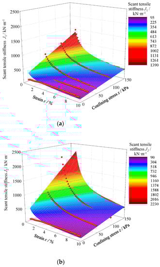 The power relation in Equation (3), which describes the secant tensile stiffness varying with tensile strain, was put forward in [] to predict the secant tensile stiffness of geotextile at different confining stresses. The corresponding fitting parameters a and b at different confining stresses were given. To predict the secant tensile stiffness using a common equation under different confinements σ and different tensile strains ε, Equation (4), derived from Equation (3), was proposed.