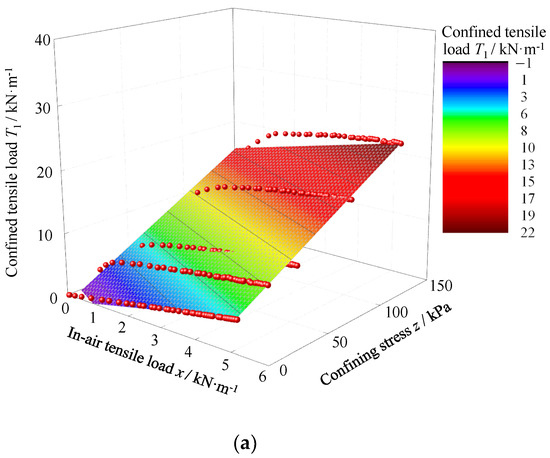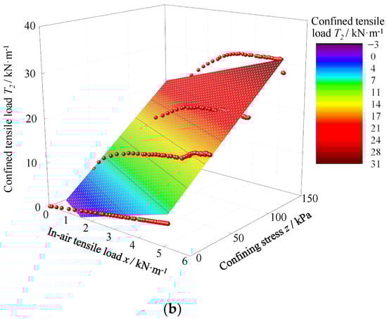 To estimate the confined tensile load of geosynthetics conveniently when the in-air tensile load and confining stress were obtained, instead of measuring confined tensile load using the tensile test in soil, a mathematical representation of the relationship among three variates (i.e., confined tensile load, in-air tensile load and confining stress) was established. A binary linear regression analysis was conducted on confined tensile load, in-air tensile load and confining stress based on [], then the width of specimen w (in m) was introduced, and the fitting coefficient e was given dimension in kN/m to bring uniform dimensions on both sides of the equals sign for mathematical representation, as shown in Equation (5).