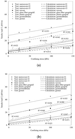 The following supporting information can be downloaded at: https://www.mdpi.com/article/10.3390/su15097376/s1. Figure S1. Tensile test results of nonwoven #2: (a) tensile load-strain curves; (b) secant tensile stiffness-strain curves; Figure S2. Tensile test results of nonwoven #3: (a) tensile load-strain curves; (b) secant tensile stiffness-strain curves; Figure S3. Tensile test results of woven: (a) tensile load-strain curves; (b) secant tensile stiffness-strain curves Figure S4. Tensile test results of glass fiber geogrid: (a) tensile load-strain curves; (b) secant tensile stiffness-strain curves; Figure S5. Tensile test results of plastic geogrid: (a) tensile load-strain curves; (b) secant tensile stiffness-strain curves; Figure S6. Tensile test results of geomembrane: (a) tensile load-strain curves; (b) secant tensile stiffness-strain curves; Figure S7. Tensile test results of geonet: (a) tensile load-strain curves; (b) secant tensile stiffness-strain curves; Figure S8. Fitting results of secant tensile stiffness of nonwoven #1 under confinement: (a) with friction; (b) without friction; Figure S9. Fitting results of secant tensile stiffness of nonwoven #2 under confinement: (a) with friction; (b) without friction; Figure S10. Fitting results of secant tensile stiffness of nonwoven #3 under confinement: (a) with friction; (b) without friction; Figure S11. Fitting results of secant tensile stiffness of glass fiber geogrid under confinement: (a) with friction; (b) without friction; Figure S12. Fitting results of secant tensile stiffness of plastic geogrid under confinement: (a) with friction; (b) without friction; Figure S13. Fitting results of secant tensile stiffness of geomembrane under confinement: (a) with friction; (b) without friction; Figure S14. Fitting results of secant tensile stiffness of geonet under confinement: (a) with friction; (b) without friction; Figure S15. Fitting results of confined tensile load of nonwoven #1: (a) with friction; (b) without friction; Figure S16. Fitting results of confined tensile load of nonwoven #2: (a) with friction; (b) without friction; Figure S17. Fitting results of confined tensile load of nonwoven #3: (a) with friction; (b) without friction; Figure S18. Fitting results of confined tensile load of woven: (a) with friction; (b) without friction; Figure S19. Fitting results of confined tensile load of glass fiber geogrid: (a) with friction; (b) without friction; Figure S20. Fitting results of confined tensile load of plastic geogrid: (a) with friction; (b) without friction; Figure S21. Fitting results of confined tensile load of geonet: (a) with friction; (b) without friction.