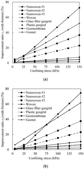 Figure 9 shows the improvement ratio γ1 (for the test with friction) and γ2 (for the test without friction) of geosynthetics at 2% strain as calculated by Equations (6) and (7). Figure 9a shows the improvement ratio γ1 increased with the increase in confining stress, indicating the confined tensile load with friction improved more compared to in-air tensile load under greater confining stress. The improvement ratios of tensile load for nonwoven geotextile #1 and geonet were far greater than 2.0. Figure 9b shows that the improvement ratio γ2 increased with the increase in confining stress, indicating the confined tensile load without friction improved more compared to in-air tensile load under greater confining stress. The nonwoven geotextiles and geonet still had greater improvement ratios γ2 compared to the other four types of geosynthetics.