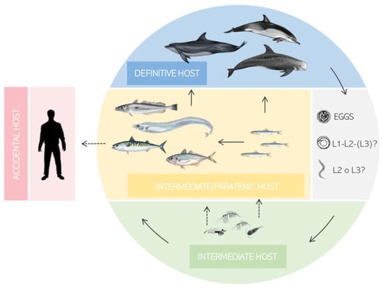 Different species of Anisakis have a complex life cycle involving various marine organisms at different levels of the trophic web of the marine ecosystem (Figure 1). Crustaceans (krill) are the first intermediate hosts, while fish and squid are the intermediate/paratenic hosts and, finally, marine mammals, mainly cetaceans, are the definitive ones where the nematodes reach the adult stage (Figure 1). The third-stage larvae of Anisakis can infect the edible part of numerous fish and squid species worldwide, including those of commercial importance (i.e., anchovies, hakes) (for a review, see []). Humans become accidental hosts by eating raw or undercooked parasitized fish or squid containing live larvae of these parasite species. Anisakis penetrates the mucous layers of the gastric-intestinal tract, causing the zoonotic disease known as “anisakiasis” ([] for a review). Therefore, the zoonotic disease is acquired by humans through the ingestion of raw or undercooked sea products []. Thus, the study of Anisakis is nowadays an increasingly hot topic in medicine, biology, and epidemiological studies. Among the genetically characterized species of the genus Anisakis, so far A. pegreffii and A. simplex (s.s.) are known to be able to provoke human anisakiasis [,,]. Those two zoonotic species can provoke in humans gastric, gastro-allergic, and intestinal anisakiasis. In addition, IgE hypersensitization in Italian patients has been also reported due to the species A. pegreffii []. Anisakiasis is becoming an increasingly significant human health risk which must be made known to the population, due to the growing increase in this severe infection, particularly in countries where raw fish consumption is frequent (reviewed in [,,]). As a result, cases of the disease are increasingly being reported from Asia (more than 50%), with the remainder coming from Europe (i.e., Italy, Spain, France, and Croatia) [,,]. Therefore, in these countries, where fish and raw fish consumption are a central part of the diet, this phenomenon cannot be underestimated.