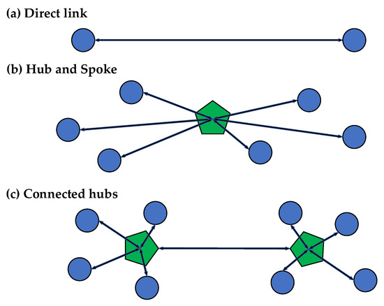 Author Woxenius proposes six different principles for the design of transport systems. Nodes (terminals) can be connected by direct links, corridors, hub and spoke, connected hubs, fixed (static) routes and flexible (dynamic) routes. Figure 1 shows three of six possible designs; (a) Direct link, (b) Hub and Spoke, and (c) Connected hubs. The blue circles represent the origin and destination nodes and the green pentagons represent hub terminals. Direct connection is equivalent to a point-to-point network, where a direct link connects each origin point to a destination point. In the hub and spoke system, a single node is defined as the central terminal through which all transport must pass, even if the distance between the nodes is shorter when goods are transported directly. As shown in Figure 1, connected hubs are a mixed transport network organisation in which local cargo flows from satellite terminals are collected in hubs and hubs are connected at the regional level by direct links. Connected hubs are often used in container transport, where feeder vessels, barges, shuttle trains or trucks supply the hubs with cargo and containers. Direct links between hubs are often made by block trains and shuttle trains [17]. The connected hubs model is a type of hub and spoke system where satellite links connect nodes to hub terminals and inter-hub links connect pairs of hubs. Inter-hub links can be referred to as primary routes and satellite links as secondary routes [18,19].