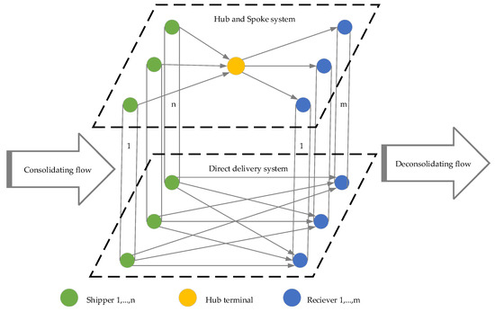 The most direct way to connect a certain number of points at different geographical locations is a direct link. This system is equivalent to a point-to-point network, where a direct link connects each origin point to a destination point. As the number of origin and destination nodes increases, the distribution network and the number of connections increase exponentially [20]. A direct link is a direct connection between an origin and a destination without involving other nodes [17]. The direct link has the highest degree of flexibility. It is most efficient when the flow of goods is large enough, i.e., when the transport capacities are utilised. When the utilisation is low, the direct connection between two terminals is no longer profitable. In this case, it is better to consolidate the cargo in one of the transhipment nodes. A direct link assumes that all cargo loaded at the origin terminal has the same destination. Such a concept requires a constant high volume of cargo on certain routes [21]. A direct link is used when the delivery time is short, when the goods should not be mixed with other goods and when the shipments are large enough to fill the loading space [22].