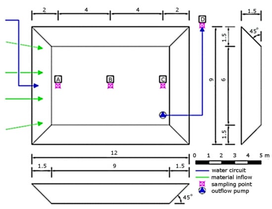 The location of the points for the monitoring of physical parameters and for water sampling are shown in Figure 5, labelled A, B, C and D. Sampling points A, B, and C were aligned along the centre line of the basin, close to the inflow position (A), in the middle of the basin (B), and at the end of the basin (C), respectively. Station D refers to the sampling at the outflow of the pipeline.