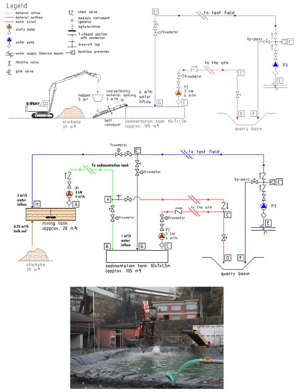 Schemes for alternative feeding of soils into the basin: bucket excavator and conveyor belt (top), pumping of slurry (middle), and picture of the installation (bottom). Capital letters (in squares) are references for the identification of the individual branches of the hydraulic circuits.