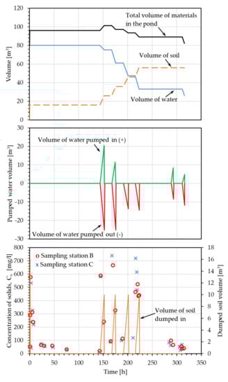 During the last two days (day 13 and 14), the activities were focused on checking the response of the system without any addition of solid material by controlling a reduced inflow and outflow rate. The water volume into the basin was gradually reduced from 80 m3 up to about 25–27 m3 at the end of the experiment.