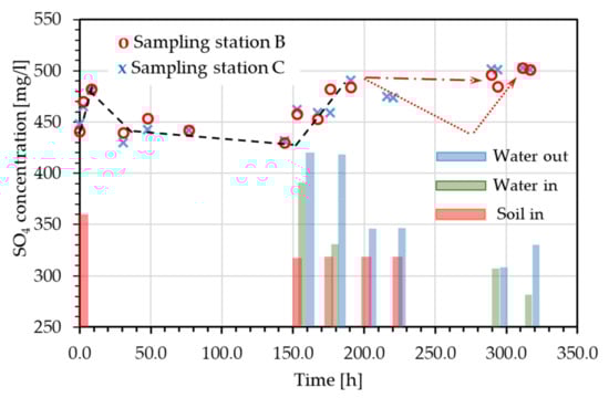 The sulphate concentration in the pilot test could be assessed by considering the water inflow and outflow rates, the volume of solid material, and the water volume within the basin. The mass balance was critical to estimate the potential lixiviation effect of the solid material in terms of mass of sulphate released per unit mass of solid (parameter Msul).