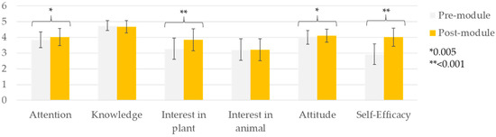 Figure 2 and Table 4 present a statistical analysis examining the impact of the ESD-integrated botanical lesson on the participants’ plant awareness. A dependent t-test was used to analyze the data. The results showed a statistically significant difference but small effect sizes in favor of the post-test mean scores for the attention (t (90) = −2.64, p < 0.05, Cohen’s d = 0.28) and attitude (t (90) = −2.61, p < 0.05, Cohen’s d = 0.28) dimension of plant awareness. However, no statistically significant difference was found for the knowledge dimension (t (90) = 2.15, p > 0.05, Cohen’s d = 0.23). While there was a statistically significant difference and a large effect size in favor of the post-test mean scores for relative interest in plants (t (90) = −7.54, p < 0.05, Cohen’s d = 0.70), there was no significant difference for relative interest in animals (t (90) = −7.54, p < 0.05, Cohen’s d = 0.00). Finally, for self-efficacy, there were both statistically significant differences in favor of the post-test mean scores and a very large effect size (t (90) = −12.48, p < 0.05, Cohen’s d = 1.31).