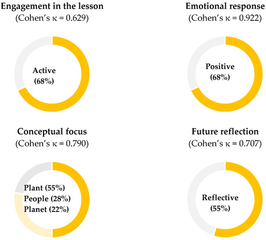 The reflective journals consisted of 6 entries for each of the 91 participants, totaling 546 entries and covering four prompts: engagement with the lesson (P1), emotional response (P2), conceptual focus (P3), and future reflection (P4). The inter-rater agreement was evaluated using Cohen’s Kappa Coefficient [49], and the results indicated good to very good agreement between raters for four of the questions: good for P1, very good for P2, very good for P3, and good for P4. The conceptual analysis of the reflective journal is summarized in Figure 3. The majority of the participants (68%) reported active engagement with the ESD-integrated botanical lesson. The participants’ positive responses to the lessons were evident, with 68% expressing their satisfaction and appreciation for the learning experience. The participants noted that the lessons expanded their knowledge about plants and their role in sustainability. Despite the positive feedback, the analysis of the qualitative data revealed a discrepancy in the participants’ conceptual focus. More participants concentrated on plant-focused content (50%) compared to people-focused (28%) or planet-oriented content (22%). Another area for improvement emerged when analyzing the participants’ ability to reflect on their learning experiences. Only slightly over half of the participants (55%) were able to consistently reflect on what they had learned.