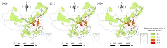 This study used a four-quadrant approach to classify the supply–demand relationship for ecosystem services into high supply–high demand (H–H), high supply–low demand (H–L), low supply–high demand (L–H) and low supply–low demand (L–L) patterns. In terms of composition, the number of low-supply–low-demand (L–L) cities is the largest, with 53, 53 and 49 in 2000, 2010 and 2020, respectively. The number of high-supply–low-demand (H–L) cities is the second largest, with 39 in all three years. The number of low-supply–high-demand (L–H) cities is 32, 32 and 36 in 2000, 2010 to 2020, respectively. The number of high-supply–high-demand (H–H) cities is the lowest, with only one city, Nanyang (Figure 2).