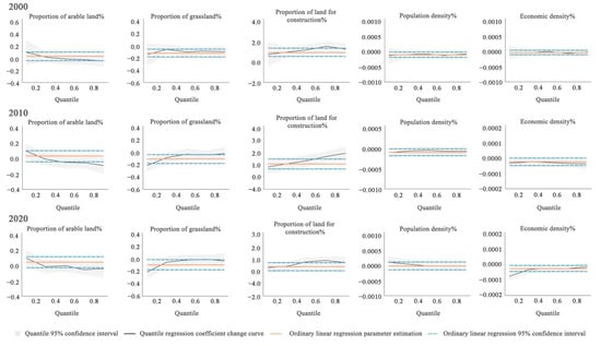 A quantile regression model was further used to reveal the mechanism of the key influencing factors on the relationship between supply and demand at different levels of coupling coordination degree. As indicated by the quantile regression results (Table 6 and Figure 4), the influencing factors on the supply–demand coupling coordination degree of ecosystem services at different times and quantile points showed significant differences.