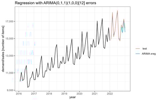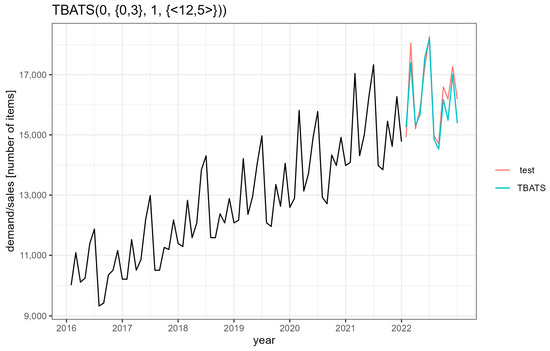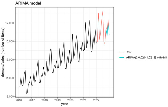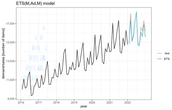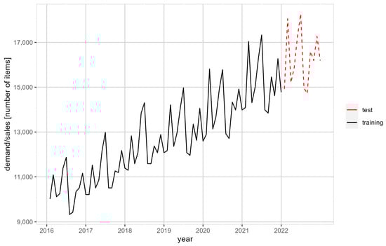 The company studied is engaged in the distribution of global brands of electronic equipment in Poland. The goods are imported from China. Observations on the sales of the company’s key product were studied. Observations are archived on a monthly basis. The collected data set was divided into a training set and a test set. The training set was used to construct models that identify the series under study and determine the forecast for the subsequent period. The test set was used to validate such models. The training set contains observations from January 2016 to December 2021 and the test set from January to December 2020. (Figure 1).