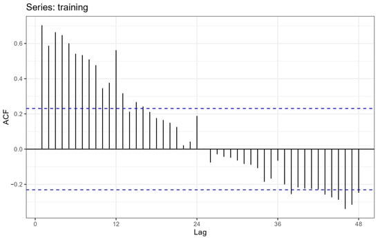 Stationarity analysis using the Box–Ljung test showed that at the significance level of , there are no grounds to reject the hypothesis of non-stationarity of the series. The value of the test statistic was X-squared = 0.35536, while ; therefore, the series satisfies the condition of stationarity. A graph of the autocorrelation function is presented in Figure 11.