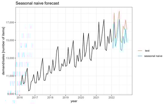 Demand forecasting is a critical component of a business’s operations and its ability to gain a competitive advantage in the market. Reliable and precise forecasts help businesses better adjust to market needs and meet customer demands more effectively [1,2]. In addition, they support process optimization, cost minimization, and reduce inventory problems [3,4,5]. Many companies, however, do not use mathematical forecasting at all, basing decisions on orders or inventory levels solely on subjective judgment or qualitative approaches [6,7,8,9].