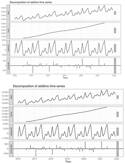 The basic idea of exponential smoothing is to assign (exponentially) decreasing weights to historical observations when determining the forecast of a future observation. A general class of models, called ETS (exponential smoothing state space model), occupies a special place among the methods based on exponential smoothing. The individual letters of the acronym stand for error, trend, and seasonality, respectively. Its elements can be combined in an additive, multiplicative, or mixed way. The trend in exponential smoothing is a combination of two components—i.e., level and increment combined with each other, taking into account the damping parameter in five possible ways. Denoting the trend forecast for subsequent periods as , we obtain [49]: