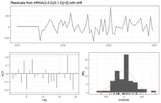 As can be seen, the differences in forecast errors are not drastic. In addition, Figure 5, Figure 6, Figure 7, Figure 8 and Figure 10 show that all models performed quite well in forecasting development trends and seasonal changes and can be used in short-term forecasting. The validity of the finally selected model still needs to be verified, of course, as presented below. Since the most satisfactory results were obtained for the ARIMA (2,0,0) (0,1,0) [12] with the drift model, the diagnostics are presented on this particular example, analyzing the distribution of residuals.