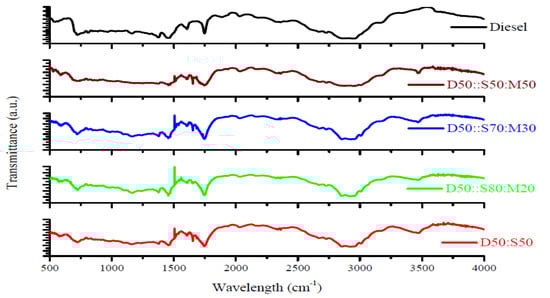 The FTIR spectra of the fuel samples of D50::S50:M50, D50::S70:M30, D50::S80:M20, D50:S50, and diesel are depicted in Figure 1. In FTIR spectra, the “C=O signal area” (1692–1805 cm−1) is employed for the estimation of the quantity of C19H32O2 present in the biodiesel-diesel blended fuel samples. The spectra region from 1702–1803 cm−1 is attributable to the C=O bond stretching, which is typically the esters present in FAME in all other blended fuel samples. Spectra signals from 1460 to 1300 cm−1 correspond to the asymmetric stretching of -CH3 bonding [21]. Alcohol spectra from 3050 to 3600 cm−1 were found to be absent in D50:S50, D50::S80:M20, and D50::S70:M30, which signifies the non-appearance of any residual alcohol [31]. All samples had a C=O bond at 1742.65 cm−1, while diesel did not, indicating the difference between the two fuels [32]. The peak obtained in-between 3300–3600 cm−1 is of -O-H axial and was found to be present in D50::S50:M50. In D50::S50:M50, D50::S70:M30, D50::S80:M20, and D50:S50, the peak in the region of 2927 cm−1 was that of =C-H2. However, the peak in the region of 1750 cm−1 was that of C=O, which is due to the stretching of the strong ester carbonyl-bond. This indicates the existence of FAME and its maximum at 1747 cm−1. All the samples showed the occurrence of triglyceride ester linkage presence at 1745 cm−1. The peak at 1746 cm−1 was found to be different, and the C=O stretching band was found to have shifted to the lower wave numbers, such as 1746.85 cm−1, thus indicating the increasing deterioration of the biodiesel-blends with MO. The spectrum ranging from 728 cm−1 to 1165 cm−1 depicts the aromatic-hydrocarbon, while peaks in the region of 1162 cm−1 to 1238 cm−1 depict the C-O bonds absorption [33]. The absorption at 1373 cm−1 designates the C-H group, whereas the peak at 1458 cm−1 depicts the blending-absorption of =CH2. Each sample spectra have a C-H bond/wavelength with length ranging from 2800 to 3000 cm−1. In D50::S70:M30, and D50::S80:M20, the peak reported at 1194 cm−1 is due to the stretching of O-CH3, which is a trace of FAME. The IR spectra of sample D50::S70:M30, D50::S80:M20, and D50:S50 comprise peaks of -COOC-H3 at 1460 cm−1. Again, the peak IR in the region of 1195–1246 cm−1 is that of -C-O-C- which is present in D50::S80:M20,D50::S70:M30 and D50:S50 [34]. No interruptions were found to be reported at 1750 cm−1, but the signals of diesel were found to interfere at 1170–1200 cm−1. The peak was observed at 2668 cm−1, D50::S70:M30, D50::S80:M20, and D50:S50 at 2729 cm−1 in diesel and the presence of spectra in the range of 3100 cm−1 to 2700 cm−1 in all these samples is due to the absorption of the C-H bond [35].