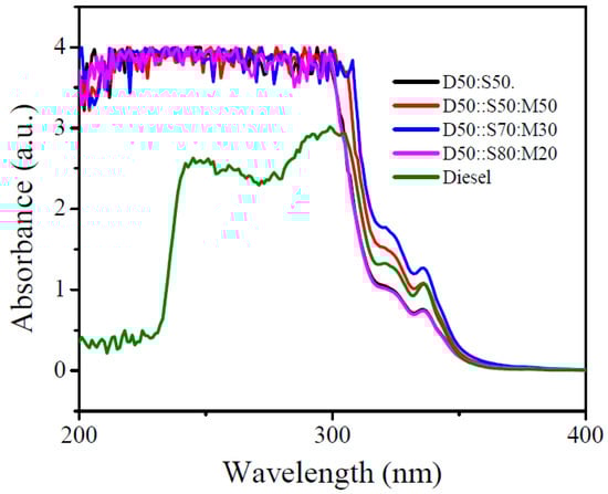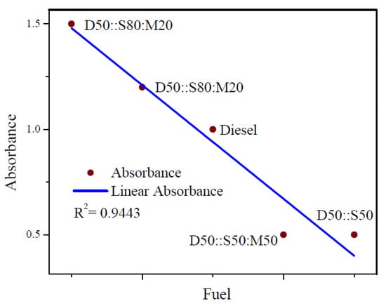 Both C18H32O2 acid as well as the methyl ester, i.e., completely saturated as well as monounsaturated FAME in the UV region, were not found to be absorbed fiercely, while polyunsaturated samples were found to be absorbed strongly and possessing characteristic spectra [39]. Least absorption was found to be for D50:S50 and D50::S80:M20, followed by diesel while D50::S80:M20 and D50::S70:M30 samples indicated maximum absorbance. Similar results were also obtained in characterization of Glycine max biodiesel, where D100 exhibited least absorbance [30]. As the blending of biodiesel increased, the linearity of absorbance decreased, which can be attributed to a diminution in the content of aliphatic compounds (Figure 3). The relationship between linear-absorbance, and the percentage of biodiesel at 320 nm is highly correlated, with a coefficient of determination (R2) of 0.9443.