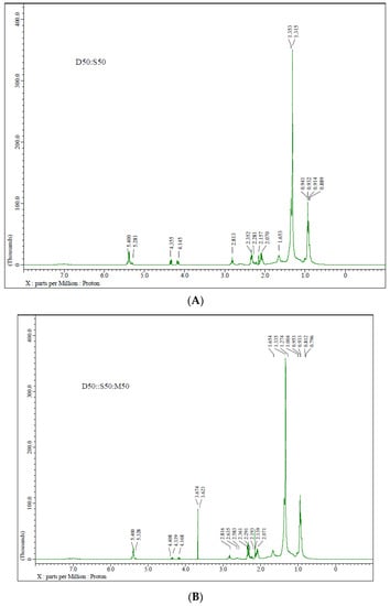 The samples of D50::S70:M30, D50::S80:M20, and D50::S50:M50 showed characteristic singlet at 3.6 ppm primarily because of methyl ester moiety. However, the occurrence of a peak at 3.60 in D50::S50:M50, 3.66 in D50::S70:M30 and 3.64 in D50::S80:M20 (Figure 4A–D) distinguishes them from diesel and D50:S50. The triplet in the region of 0.8 ppm is that of methyl-hydrogen and is present D50::S70:M30, D50::S80:M20, and D50::S50:M50, while the peak at 4.0–4.6 pertains to the glyceryl-groups, and is found in D50::S70:M30, D50::S80:M20, D50::S50:M50 and D50:S50. The spectra of B100 displayed the peak at 1.2 ppm as well as at 1.59, and this 1.59 ppm is that of methylene of carbon-chain, and beta-carbonyl methylene. The signal of -OC=O-CH2 is reported in all biodiesel blends at around 2.28 ppm [18,40,41]. In D50:S50 peaks at 2.0, 2.8 as well as 5.28 ppm are allylic, bis-allylic, and olefinic-hydrogen correspondingly. The NMR spectra of diesel indicated a number of peaks in the region of 0.8–2.8 ppm from aliphatic-hydrogen, and a few regions of 6.79–7.25 ppm ranges from aromatic-hydrogen. Table 5 indicates the functional group, as well as the corresponding ppm of these samples’ peaks.