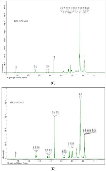 (A) 1H NMR spectrum of D50:S50. (B) 1H NMR spectrum of D50::S50:M50. (C) 1H NMR spectrum of D50::S70:M30. (D) 1H NMR spectrum of D50::S80:M20.