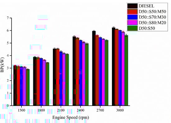 It is the power acquired after removing the frictional power is met due to frictional losses in the engine from the specified power. The relationship between engine-speed and brake-power is shown in the graph below for the various tested fuel samples is depicted in Figure 5. It was found that as engine speed increased, BP increased as well. The maximum value of the BP was observed at the maximal engine-speed of 3000 rpm”. Moreover, the BP for diesel, D50:S50:M50, D50::S70:M30, D50::S80:M20, and D50:S50 was 6.83, 6.11, 6.02, 5.88, and 5.62 kW respectively. The results revealed that D50:S50:M50, D50::S70:M30, D50::S80:M20, and D50:S50 showed 1.9%, 3.37%, 5.61%, and 6.1% respectively lower maximum brake power at 3000 rpm in comparison with diesel. Despite the molecular structure containing a larger proportion of oxygen, D50:S50 produced much lower brake power because of less efficient combustion due to its escalated kinematic viscosity. The mean-values of BP for all engine speeds for Diesel, D50::S50:M50, D50::S70:M30, D50::S80:M20, and D50:S50 were 4.89, 4.78, 4.65, 4.53, and 4.38 kW respectively. Thus, it was observed that D50::S50:M50, D50::S70:M30, D50::S80:M20, and D50:S50 produced respectively 2.2%, 4.9%, 7.36% and 10.4% lesser power than that of diesel. This impact is best explained by the cumulative influence of the blended fuel samples’ lower energy content and highest viscosity relative to diesel [42].