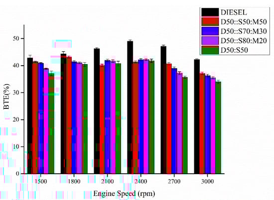 Thermal efficiency is defined as the proportion of power-output to the rate of heat-energy incorporated through fuel-injection into the engine-cylinder. The power-input supplied to the engine-cylinder is the product of the mass flowrate of injected-fuel, and its calorific-value. The fluctuation of BTE with an engine-speed (rpm) for distinct fuel samples is depicted in Figure 6. The maximal BTE was observed at 2400 rpm, and the values of BTE ascertained at 2400 rpm for Diesel, D50::S50:M50, D50::S70:M30, D50::S80:M20, and D50:S50 was 48.99%, 41.39%, 42.15%, 42.25%, and 41.19% respectively. However, the average values of BTE for Diesel, D50::S50:M50, D50::S70:M30, D50::S80:M20, and D50:S50 were 45.31%, 40.64%, 40.28%, 39.41% and 38.28% respectively. Thus, D50::S50:M50, D50::S70:M30, D50::S80:M20, and D50:S50 produced 10.3%, 11.10%, 13.02%, and 15.51% diminution in BTE respectively by comparison with diesel. The combination of the fuel’s raised viscosity and reduced heating-value results in the lower BTE [43]. The addition of MO to SME to the fuel samples escalated the BTE of engine, which is owing to superior power output and lowered BSFC as compared to D50:S50.
