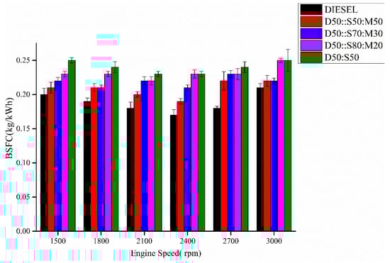 BSFC is the mass rate of the fuel combusted to produce unit BP. Figure 7 illustrates the BSFC for all fuel samples at various engine speeds. It was found that the BSFC of the engine was decreased (1500 to 2400 rpm) and then escalated with the increase in the engine-speed (2400 to 3000 rpm). BSFC was found to be lowest at 2400 rpm. The average values of BSFC for Diesel, D50::S50:M50, D50::S70:M30, D50::S80:M20, and D50:S50 were found to be 0.188, 0.208, 0.218, 0.231, and 0.240 kg/kWh respectively. Thus, D50::S50:M50, D50::S70:M30, D50::S80:M20, and D50:S50 showed 10.6%, 15.9%, 22.8% and 27.6% higher BSFC respectively as compared to diesel. However, D50:S50 possessed the minimal calorific-value, due to its highest density, and fuel-borne oxygen among all the tested-fuels. The higher viscosity and volumetric effect of the constant fuel injection rate of biodiesel blends resulted in a rise in fuel consumption [43]. The inclusion of SME further reduced the calorific value of the fuel samples.