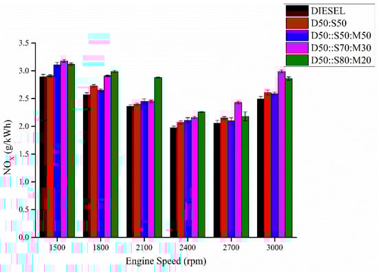 Variation of NOx of samples (Diesel, D50::S70:M30, D50::S80:M20, D50::S50:M50 and D50:S50) with engine-speed at constant-load.
