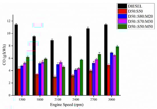 The fuel partially burns, usually at low temperatures, producing CO [8]. Figure 9 shows the relationship between engine-speed and CO emissions. The average CO emission reductions for D50:S50:M50, D50:S70:M30, D50:S80:M20, and D50:S50 were 40.09%, 47.12%, 49.36%, and 63.02%, respectively as compared to diesel. As a result of combined effects of the higher CN and oxygen contents, the concentration of CO emissions is low [45]. Shorter ignition delays and longer combustion durations are depicted with higher CN values. The increased oxygen-concentration in biodiesel plays a vital role in enhancing the combustion-process. The elevated oxygen concentration within the cylinder results in increased temperature, leading to complete combustion, and improved transformation of CO to CO2 in biodiesel compared to diesel-fuel [46]. The addition of the MO leads to an increase in the CO concentrations of 36.93%, 43.79%, and 62.0% as compared to D50:S50.