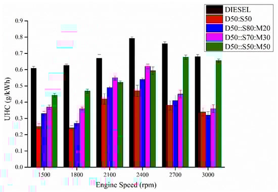 Variation of UHC of samples (Diesel, D50::S70:M30, D50::S80:M20, D50::S50:M50 and D50:S50) with engine-speed at constant-load.