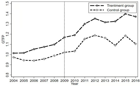 A vital premise for the use of a DID method is that there is a common change trend in the samples of the experimental group and the control group before the event. This study makes a common trend test on the growth changes of urban GTFP of the experimental group and the control group before and after the implementation of NIIDZ. Results are shown in Figure 1 and Figure 2.